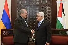 Armenian-Palestinian relations refers to relations between Armenia and the State of Palestine. Armenia supports Palestinian statehood.[1] Armenia is an observer state of the Arab League in which Palestine is a full member. The former President of Armenia Serzh Sargsyan has stated Armenia supports the Palestinian People's self determination in an interview with Al Mayadeen.[2] President of Palestine Mahmoud Abbas has also stated that he supports the expanding of Armenia, and called Armenians a "great ally of Palestine".[3]