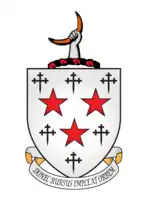 Escutcheon: Barry wavy of six argent and azure, a cross moline gules; on a chief of the last an open book proper clasped Or inscribed with the words 'Quarente Ostium', in Roman characters sable between two domed towers also proper, that to the dexter ensigned with an increscent of the first and that to the sinister with an estoile, also Or. |