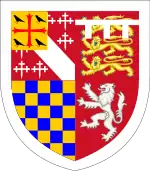 Escutcheon: Quarterly: 1st and 4th, Sable a lion rampant Argent, on a canton of the second a cross Gules (Churchill); 2nd and 3rd, quarterly Argent and Gules a fret Or, over all on a bend Sable three Escallops of the first (Spencer); over all in the centre chief point (as an augmentation of honour) an escutcheon Argent charged with the cross of Saint George in the centre point an open book Argent. |