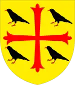 Escutcheon: Or, three chevronels gules, impaling Or, a cross gules; all within a bordure sable guttee d'Or. [38] |