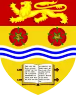 Escutcheon: Or, a fesse wavy argent charged with two barrulets wavy azure between in chief two roses gules barbed and seeded and in base an open book proper bound and clasped; on a chief gules a lion passant Or. |