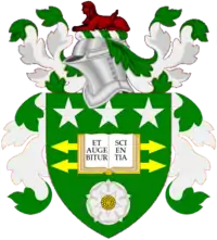Escutcheon: Vert an open book Proper edged and clasped Gold inscribed with the words "ET AUGEBITUR SCIENTIA" between in chief three mullets Argent and in base a rose of the last seeded Proper. |