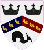 Escutcheon: Argent, on a chevron per pale Azure and Gules six martlets Or, between in chief two Saxon- crowns and in base a dolphin naiant Sable. |