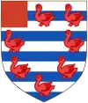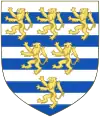 Barry of ten argent and azure a lion counter-rampant gules. Motto: QVI PLVS MORTIS CONPTEMTOR QVAM LEO FORTIS "Who fears death less than lion's strength."[3] |