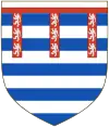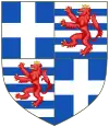 Quartered, 1 in silver, a cross of gold, between four crosses of the same, 2 barry silver and azure eight rooms, a lion rampant, armed, langued and crowned with gold , stitching on the whole, 3 gold lion rampant, armed, langued and crowned azure and 4 silver lion rampant, armed, langued and crowned with gold. Motto: Pour loyauté maintenir "To maintain loyalty" |