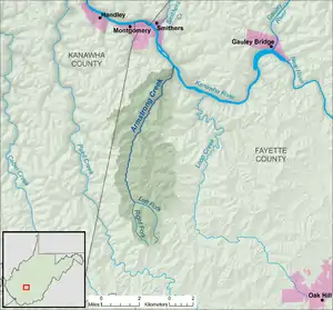 Armstrong Creek is a tributary of the Kanawha River, 8.6 miles (13.8 km) long,[5] in southern West Virginia in the United States. Via the Kanawha and Ohio rivers, it is part of the watershed of the Mississippi River, draining an area of 22.8 square miles (59 km2)[6] on the unglaciated portion of the Allegheny Plateau. The creek flows for its entire length in western Fayette County; its tributaries additionally drain a small portion of eastern Kanawha County.