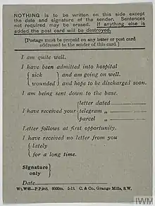 The unit also issued standard British Army forms and documents and printed in English, Flemish, French, Chinese and various Indian languages.[3][4] Some documents had a very wide distribution and huge production runs were necessary – such as for the field service postcards that were regularly issued to every man in the British and Indian Armies – while some manuals were highly specialised and print runs of only 500 were made.[12][11] Partridge's unit also undertook the printing of mess menus and Christmas cards.[17] The Army Printing and Stationery Service was also responsible for the manufacture and issuing of the rubber stamps used by mail censors.[11] From 1916 all documents produced by the unit were denoted with a SS (Stationery Service) reference code.[11] During a paper shortage in 1918 Partridge implemented a large scale paper recycling campaign.[17]