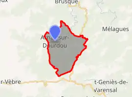 Arnac-sur-Dourdou is a sparsely populated commune in the extreme southern corner of Aveyron some 50 km west by north-west of Saint-André-de-Sangonis and 8 km east by north-east of Murat-sur-Vèbre in the heart of the Lacaune mountains. The western border of the commune is also the border between the departments of Aveyron and Tarn while the southern border is the border between Aveyron and Hérault. Access to the commune is by the D92 road from Brusque in the north which is a tortuous mountain road going to the village and continuing west to change to the D162 at the commune border then south to join the D622 to Murat-sur-Vèbre. The D12 road from Brusque to the south forms the eastern border of the commune and road D174 connects the village to this road. The commune is mountainous and heavily forested.[4]