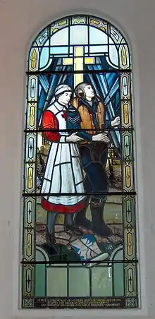 Arnold Wathen Robinson was the eldest of five sons, and three of his brothers were to be killed in the Great War.[4][nb 1] Arnold himself had joined the Artists Rifles but was released from military service provided he took up war work. On release from the Army, Arnold became the manager of a shell factory but still managed to go on making stained glass. In the Second World War Arnold worked as an Air Raid Warden during the blitzes that Bristol endured.[5]
