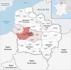 The arrondissement of Amiens is an arrondissement of France in the Somme department in the Hauts-de-France region. It has 291 communes.[2] Its population is 304,282 (2016), and its area is 2,343.1 km2 (904.7 sq mi).[3]