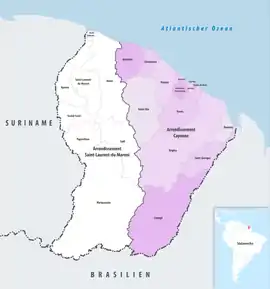 The arrondissement of Cayenne, containing the coastal strip of French Guiana, was established in 1947.[4] In 1969 the arrondissement of Inini, which covered the inland territory of French Guiana, was disbanded, and the territory of French Guiana was divided between the arrondissement of Cayenne and the new arrondissement of Saint-Laurent-du-Maroni.[5]