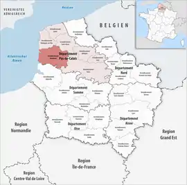 The arrondissement of Montreuil is an arrondissement of France in the Pas-de-Calais department in the Hauts-de-France region. It has 164 communes.[2] Its population is 112,118 (2016), and its area is 1,327.1 km2 (512.4 sq mi).[3]