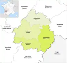 - Arrondissement of Périgueux, (prefecture of the Dordogne department: Périgueux) with 143 communes.[4] The population of the arrondissement was 175,309 in 2016.