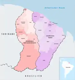 At the creation of the department of Guyane in 1947, its only arrondissement was Cayenne.[2] The arrondissement of Inini, containing the previously unincorporated inland territory of French Guiana, was created in 1951.[3] In 1969 the arrondissement of Inini was disbanded, and the territory of French Guiana was divided between the arrondissement of Cayenne and the new arrondissement of Saint-Laurent-du-Maroni.[4]