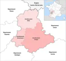 - Arrondissement of Bellac, (subprefecture: Bellac) with 57 communes.[2] The population of the arrondissement was 39,204 in 2016.