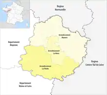In 1800 the arrondissements of Le Mans, La Flèche, Mamers and Saint-Calais were established. The arrondissement of Saint-Calais was disbanded in 1926.[4] In February 2006 the arrondissement of Le Mans lost the five cantons of La Chartre-sur-le-Loir, Château-du-Loir, Le Grand-Lucé, Loué and La Suze-sur-Sarthe to the arrondissement of La Flèche, and the six cantons of Bouloire, Conlie, Montfort-le-Gesnois, Saint-Calais, Sillé-le-Guillaume and Vibraye to the arrondissement of Mamers.[4][5] In August 2012 the commune Champagné passed from the arrondissement of Mamers to the arrondissement of Le Mans, and the communes Beaufay, Courcemont and Savigné-l'Évêque passed from the arrondissement of Le Mans to the arrondissement of Mamers.[6]