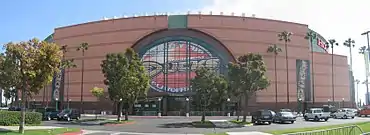 The idea for a large indoor arena in Anaheim emerged from entertainment attorney Neil Papiano, who in 1987 randomly selected two of the city's councilmen from the telephone directory to sell them his idea. They approved of the concept, and one year later following location surveys, the placement was chosen at a seven-acre parcel at Douglass Road and Katella Avenue, that at the time was owned by the German social group Phoenix Club. Papiano also managed to get financial backing from two New York-based firms, Ogden Corporation and Nederlander Organization.[9] Even if there was a dispute to build an arena on Orange County with a Santa Ana project led by Spectacor, and there were discussions of feasibility of the arena given the National Basketball Association and National Hockey League were at the time unwilling to expand to the area,[10] the city of Anaheim pushed forward to built the Hellmuth, Obata & Kassabaum, Inc.-designed arena,[11] which broke ground in November 1990.[9] A tenant was finally found in 1992, as The Walt Disney Corporation had just been awarded an NHL franchise for Anaheim, entering negotiations to lease the arena.[12] Once the deal was broken, the arena's final cost ended at $121 million, as $18 million were added to finance hockey franchise fees and facility improvement.[9]