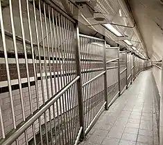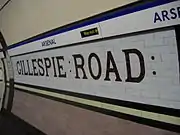 The suffix was dropped from the station's name some time around 1960, giving the current name of Arsenal.[lower-alpha 2] The original tiled walls of the platforms still bear the Gillespie Road name, spelt out in large letters.[15] In 2007, the station underwent a major upgrade;[16] as part of this the wall tiling was completely restored, the floor resurfaced and an electronic Tannoy system was introduced.[17]