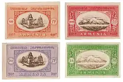 Following the creation of the First Republic of Armenia in 1918, the members of the country's Finance Ministry commissioned Fetvadjian to draw up the new currency (to replace the Russian ruble) and stamps for the nascent state.[4] The printing was conducted in Europe, and some of Fetvadjian's attractive designs featured animal motifs that were found on the decorations in Ani.[2] But just as the banknotes were being printed in Paris, Soviet Russia was completing its conquest of the republic and by December 1920, the Armenian state was finally absorbed by the Soviets. The banknotes were never put into circulation.[2]