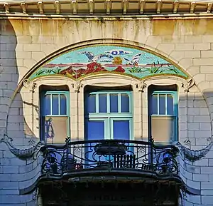 Architecture in the style of Art Nouveau appeared in Antwerp, Belgium, between roughly 1898 and the start of the First World War in 1914. It was principally practiced by the architects Joseph Bascourt, Jacques De Weerdt, Jules Hofman, Émile Van Averbeke, Émile Thielens, Frans Smet-Verhas as well as August Cols and Alfried Defever. Its principal characteristics in Antwerp buildings include whiplash lines and irregular curves in moldings, ironwork, and incised decoration; gentle arches; colorful ceramic tiles, mosaics, and stained glass; gilded asymmetrical ornament; sgraffito; and keyhole windows and screens.[1][2]