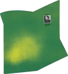 The original album cover is notorious for its unique "irregular trapezoid" shape,[53] featuring a green and yellow composition that alludes to a phrase written by Antonin Artaud 1937, which can be read in the record's booklet: "Are not green and yellow each of the opposite colors of death, green for resurrection and yellow for decomposition and decay?"[15] A small photograph of the poet appears in its right upper angle.[96][97] Artaud's cover was based on a sketch by Spinetta and designed by Juan Gatti, a designer, photographer and plastic artist (who has later stood out for being the author of graphic designs related to Pedro Almodóvar's films) , who also did the artwork of several other Argentine rock artists of the 1970s, such as Moris, Crucis, Pappo's Blues, La Pesada del Rock and Roll and Sui Generis.[98][32] Gatti has said that the aim was to make "a disturbing and uncomfortable object, something that annoys", and has described it as a product of its time, when feelings of challenging the established were prevalent among the youth.[1] He also recalled in 2013: "The album I think was more a conclusion of Luis that was super excited with Artaud and before the record we were already talking about him and other French poets. So it was normal for that record to come out. [...] We were in the present and what really interested us was having fun. Perhaps of all of us it was Luis who had the most cultural and perishable pretensions.[98]