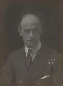 In July 1914 he was assigned to HMS Dominion,[14] in which he served during the early part of the First World War. He was later posted as executive officer of the battleship HMS Valiant, where he saw service at the Battle of Jutland, and was recommended for promotion to Captain as a result.[15] He later commanded the cruisers HMS Blonde and HMS Cordelia, and was present in the latter at the surrender of the German navy in 1918.[16] By 1919, he was in command of HMS Colossus.[17]