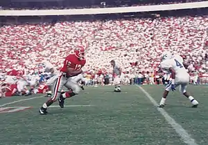 ![]() UGA's wide receiver Marshall (jersey #12) is running his route against the Kentucky Wildcats, Oct. 1991 | |||||||
