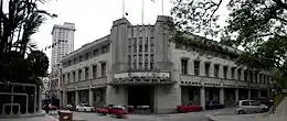 Located at the corner of Jalan Tun H. S. Lee and Jalan Hang Lekir (the former High Street and Cecil Street) in Kuala Lumpur,[18] the Lee Rubber Building was the tallest building in KL when it was constructed.[19] Modernist Art Deco rules this building with its striated lines and mouldings complete with differentiated corner treatment topped with a requisite flag pole. Its five-foot way is broken by solid wall-like pillars.[20] It has a strong geometric shape that meets a corner set at a 45° angle.[21] Like most urban Art Deco buildings, the Lee Rubber Building has a flat roof with no cornice or overhang.[22] Its pediment still sports the original name, in English and Chinese.[23]
