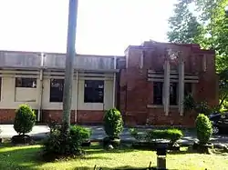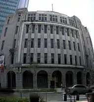 The Anglo-Oriental building has solid tower-like features flanking the corner entranceways in addition to vertical and horizontal Art Deco patterns and lines.[36] The vertically banded front elevation of the building, which is held between two towers, contrasts with the horizontal bands of the two side wings.[37] The tall, first floor windows of the Anglo-Oriental Building have individual concrete canopies, while the second floor is treated as a narrow band which appears to recede due to the deep, continuous overhang above the windows and the darker shade of Shanghai plaster.[38] An internal open courtyard was roofed over for air-conditioning in the 1960s.[39] During the 1941 Japanese invasion, the building was used as a police station. From 1986 to 1988, the architect Chen Voon Fee renovated the Anglo-Oriental Building and it was converted into Mahkota College,[40] a private college partnered with Boston University.[41][42] From 1995 to 2005, the Anglo-Oriental Building became a property of Ekran Berhad and it served as the corporate headquarters until 1 January 2005, where the second floor housed the principal place of business of the company. It was then that the present name – Wisma Ekran (House of Ekran) was established.[43][44]