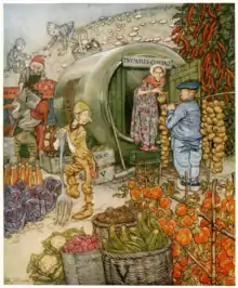 By the turn of the century, Rackham had developed a reputation for pen and ink fantasy illustration with richly illustrated gift books such as The Ingoldsby Legends (1898), Gulliver's Travels and Fairy Tales of the Brothers Grimm (both 1900). This was developed further through the austere years of the Boer War with regular contributions to children's periodicals such as Little Folks and Cassell's Magazine. In 1901 he moved to Wychcombe Studios near Haverstock Hill, and in 1903 married his neighbour Edyth Starkie.[4] Edyth suffered a miscarriage in 1904, but the couple had one daughter, Barbara, in 1908. Although acknowledged as an accomplished black-and-white book illustrator for some years, it was the publication of his full-colour plates to Washington Irving's Rip Van Winkle by Heinemann in 1905 that particularly brought him into public attention, his reputation being confirmed the following year with J.M.Barrie's Peter Pan in Kensington Gardens, published by Hodder & Stoughton. Income from the books was greatly augmented by annual exhibitions of the artwork at the Leicester Galleries. Rackham won a gold medal at the Milan International Exhibition in 1906 and another one at the Barcelona International Exposition in 1912. His works were included in numerous exhibitions, including one at the Louvre in Paris in 1914. Rackham was a member of the Art Workers' Guild and was elected its Master in 1919.[5]
