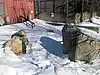 Since 1985, Omphalos, a large outdoors public art sculpture by Dimitri Hadzi, marked Harvard Square station at the center of the busy intersection.[17] Structural elements of the sculpture slowly deteriorated unnoticed, until a 1,000-pound (450 kg) piece fell off without warning. Short of funds and faced with an expensive repair bill, the MBTA considered options to either move or destroy the artwork in August 2013.[18] By December 2013, the sculpture had been removed, and its ownership had been transferred to a private developer of housing in Rockport, Massachusetts. The developer planned to restore and re-install it on a public harbor walk near a new development, with the approval of the artist's widow.[19]