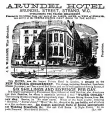 The Arundel Hotel stood at the south end of the street on the western side at the end of the nineteenth century and start of the twentieth. It billed itself as "the largest private hotel in London", providing rooms to professional men, officers, and Americans and their families, "for whom is especially provided a free "water cooler".[5] It was rebuilt in the late nineteenth century and the bay front that faced Victoria Embankment was replaced with a gothic design. The hotel existed until at least the mid-twentieth century.
