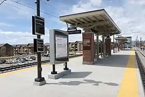 Arvada Ridge is a Regional Transportation District (RTD) commuter rail station on the G Line between Denver Union Station and Wheat Ridge, Colorado. The station is located in western Arvada, Colorado, on the west side of Kipling Parkway and near Red Rocks Community College's Arvada campus.[2] It includes bus bays, a 200-stall park and ride, and a pedestrian underpass connecting the platform to Ridge Road and the park and ride.[3] Public art at the station includes "Chromatic Harvest", a kaleidoscopic mural wall with geometric imagery of agriculture.[4] The station opened on April 26, 2019.[5]