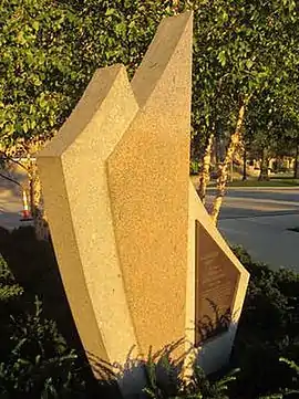 The abstract pink granite memorial features three angular elements, one of which has a metal plaque with the inscription: