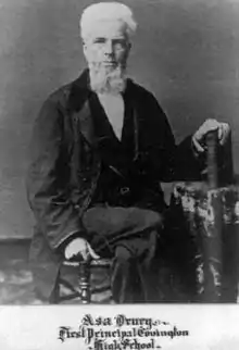 Asa Drury was born July 26, 1801, in Athol, Massachusetts, as the fifth of eleven children of Joel Drury and Ruth (Hill) Drury.[1][2] Drury studied at Yale University, earning his A.B. degree in 1829. Upon graduation, he served as rector of the Hopkins Grammar School in New Haven, Connecticut, from 1829 to 1831. He earned his A.M. degree at Brown University in 1832, followed by his D.D. from the same institution in 1834. He was ordained as a Baptist minister in Providence, Rhode Island, on September 14, 1834.[3] Drury married Hannah Perry of Brookfield, Massachusetts, on January 17, 1832, but she died within a year.[2] While studying at Brown University, he met and married Mary Elizabeth Willard. On September 7, 1834, the First Baptist Church of Providence voted to ordain Asa and to dismiss him and "Sister Mary E. Drury" to the Granville Baptist Church.[4] He and Elizabeth had two sons. Alexander G. Drury (b. 1844) and Marshall P. Drury (b. 1846).[5]
