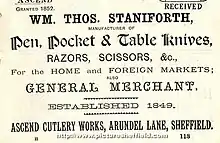 Ascend Cutlery Works was a cutlery manufacturing company based in Sheffield, England. The company was founded by William Thomas Staniforth in 1849 on Arundel Lane[1] and was noted for its razors, table knives, and scissors.[2]