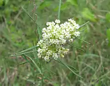 This is a perennial herb with a single stem 6 inches to 3 feet tall. The very narrow, linear leaves are arranged in whorls of 4–6 with short internodes. The inflorescence is an umbel of 7–20 greenish white flowers.[2][3] Flowers are fragrant and bloom between June and September. Its native habitats include glades, dry prairies, dry slopes, dry open woods, pastures, fields, and roadsides. The Latin specific epithet verticillata is in reference to the leaves appearing in whorls.[4]