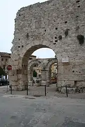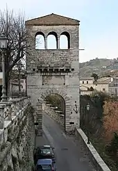 - Porta Gemina ("Twin Gate"): an ancient Roman gate from the 1st century BC, through which the Via Salaria entered the city. The ruins of the ancient theater are located nearby. It had two passageways, each 5.70 metres (18.7 ft) tall and 2.95 metres (9.7 ft) wide