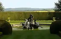 Closest to the south front of the house are paved areas of gardens in the style of Gertrude Jekyll, and from these across large areas of lawn are the terraced gardens. The dominating feature of these individual gardens is the clipped hedges, topiary and flowering shrubs. The largest feature of the garden is the bronze fountain representing "Venus in her shell chariot attended by cherubs", by the American sculptor Thomas Waldo Story. Story was also responsible for the fountain in the Dutch flower garden. This garden, so named for its displays of tulips in spring, is approached by descending a flight of steps through a rock garden, complete with dripping grotto and artificial stalagmites. In the centre of the garden Story's tall fountain, crowned by Cupid supported by dolphins, is surrounded by a formal bedding scheme.