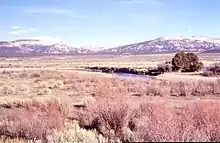 Looking east over Ash Creek in Pintura, with the Hurricane Cliffs in the distance, March 1990