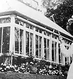 She described the external conservatory which can be seen in the photo of Ashfield above and in a close view below: "The conservatory, a grandiloquent erection, containing pots of begonias, geraniums, tiered stands of every kind of fern, and several large palm trees."[1]: p58 These palm trees can be seen in the photo.