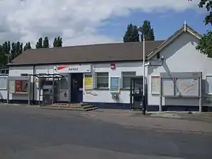 Although the station signage displays only Ashford, the station is referred to in timetables, and as printed on railway tickets, either as Ashford (Surrey), or Ashford (Middlesex) (from the historic county), in order to differentiate it from Ashford International railway station in Kent.[1][2][3]