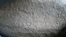 Ashoka the great expounded his policy of Dhamma through his edicts.[22] By engraving his views about Dhamma on these edicts, Ashoka tried to directly communicate with his subjects.[23] These inscriptions were written in different years of his life.[24] The inscriptions can be divided into two categories. A small group of inscriptions reveal that the king was a follower of Buddhism and were addresses to the Buddhist church—the samgha. These inscriptions are declarations of Ashoka's relationship with the Buddhist order.[25] Inscriptions of the other category are known as the Major and Minor Rock Edicts, which were inscribed on rock surfaces. This larger group includes the Pillar Edicts inscribed on specially erected pillars.[26][27]