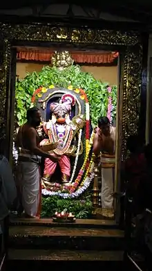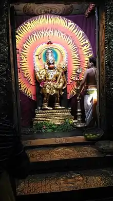 Sri Ashtamsa Varadha Anjaneyar Temple is a Hindu temple dedicated to Hanuman located in Peelamedu, Coimbatore, Tamil Nadu, India. The idol of the deity is made of Salagrama stone. In the temple, Goddess Lakshmi graces the devotees from the right palm of Hanuman who tail faces North, direction of Kubera, God of wealth. The main deity faces west, is seen posing Abhaya Mudra with his right hand and holding a mace with the other hand.[1] During the Tamil New Year, an offering of 10,008 fruits is made to the deity. Raja Maruthi Alankaram, Vennai Alankaram and Vadamalai offerings are the regular Sevas here on Saturdays. In the Tamil month of Purattasi, Vadai Malai, Swaya Roopam, Chenduram, Swarnamayam and Muthangi Sevai are offered to God on Saturdays.[2]