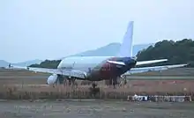 Asiana Airlines Flight 162 was a regular short-haul international passenger flight from Incheon International Airport near Seoul, South Korea, to Hiroshima Airport in Hiroshima, Japan.[1] On 14 April 2015, the Airbus A320-232 aircraft touched down short of the runway, struck the localizer array, skidded onto the runway on its tail, and spun 120 degrees before finally coming to a rest on the grass, opposite the terminal building. The aircraft suffered substantial damage to the left wing and engine. Of the 82 people aboard, 27 (25 passengers and two crew) were injured, one seriously.[2][3][4]