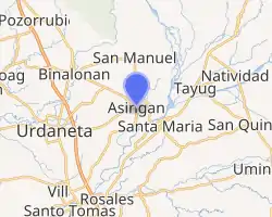 Asingan, officially the Municipality of Asingan (Pangasinan: Baley na Asingan; Ilocano: Ili ti Asingan; Tagalog: Bayan ng Asingan), is a 2nd class municipality in the province of Pangasinan, Philippines. According to the 2020 census, it has a population of 57,811 people. [3]