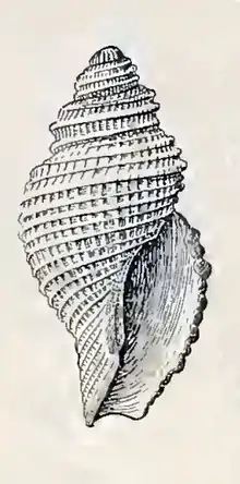(Original description) The small shell is tumidly ovate. It is whitish, thin opaque. It contains 6 whorls, convex, subangulate, neatly keeled. The keels are small, rounded, elevated; It is elegantly cancellate, with regular distant small lirae. The keels in the body whorl alternate. The sutured is deeply impressed. The apex is obtuse and cancellate. The aperture is widely ovate. The outer lip is thin and deeply sinuated posteriorly. The lip is inconspicuous. The columella is long and twisted. The siphonal canal is somewhat short.[2]