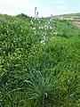 The Asphodelus aestivus is a geophyte, having an underground storage organ which enables the plant to survive adverse conditions, such as excessive heat and drought. Its leaves, growing to a height of 60 centimetres (24 in)–80 centimetres (31 in), contain alkaloids that are harmful to sheep and goats in the wet, winter months, but during the summer when their leaves dry out, they lose their toxicity.[6][7] In the Iberian Peninsula it flowers from June to September, although in the Algarve (SW Portugal) it may flower in May or at the end of April. There, the leaves are already withered by the time the plants flower.[8]
