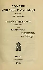 The Associação Maritima e Colonial (Maritime and Colonial Association) of Portugal formed in 1839.[1] Officials included Joaquim Jose Goncalves de Mattos Correia, Joaquim Jose Cecilia Kol, and José Xavier Bressane Leite.[1] In the 1840s it issued a monthly journal, Annaes Maritimos e Coloniaes.[2]