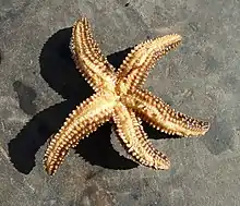 Asterias forbesi usually has 5 arms but occasionally has 4 or 6. Like many starfish species, the upper surface is covered in blunt conical projections giving it a rough feel. Some of these are pedicellariae, minute pincers that can grip objects.[2] The arms are plump, broad at the base and tapering to a blunt tip. This starfish grows to about 15 centimetres (5.9 in) in diameter with an arm length of about 6 centimetres (2.4 in). The madreporite is usually pink and is visible near the edge of the disc. There are several rows of tube feet on the underside on either side of the ambulacral groove that run down the centre of each arm. The colour of the upper side is variable, ranging from brown or tan to reddish-purple and the underside is usually pale brown.[3] Near the tip on the underside of each arm there are small eyespots. These are not set on short stalks as they are in the otherwise similar Asterias rubens with which this species can be confused.[4]